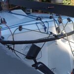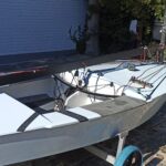 Finns 2 segel varav ett i bra skick (Höj Jensen) andra för träning (Green). Mast passande 80-85kg, sjösättningsvagn finns.
